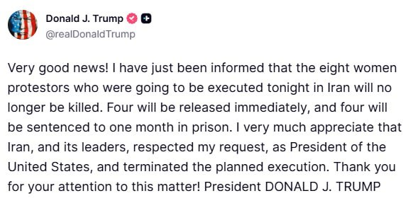 Մահապատժի դատապարտված 8 կին չի սպանվի. Իրանը և նրա առաջնորդները հարգեցին իմ խնդրանքը. Թրամփ Իրանում մահապատժի դատապարտված 8 կին ցուցարար չի սպանվի։ 4-ն ազատ կարձակվի, մյուս 4-ը կազատազրկվի 1 ամսով։ Շատ եմ գնահատում, որ Իրանը և նրա առաջնորդները հարգեցին իմ խնդրանքը: Այս մասին սոցցանցի իր էջում գրել է ԱՄՆ նախագահ Դոնալդ Թրամփը: