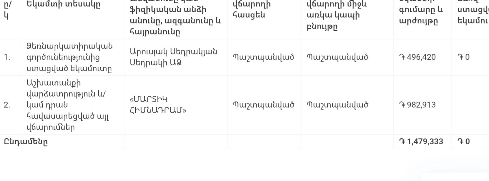Փաստաթղթերում ներկայացված տվյալների համաձայն՝ Արուսյակ Սեդրակյանը եկամուտ է ստացել նաև այլ աղբյուրներից․ շուրջ 496,420 դրամ՝ ձեռնարկատիրական գործունեությունից, 982,913 դրամ՝ «Մարտիկ» հիմնադրամից։ Թե ինչ ծառայությունների դիմաց է իրականացվել Արուսյակ Սեդրակյանի ԱՁ-ին վճարումը, այստեղ ևս թափանցիկություն չկա։