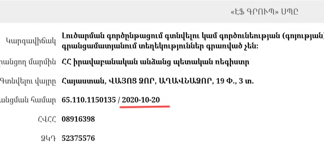 2020 թվականի հոկտեմբերի 20-ը 44-օրյա պատերազմի ամենաթեժ փուլերից մեկն էր․ Ճակատում՝ զոհեր, ներսում՝ քաոս, անորոշություն, և հենց այդ օրը գրանցվում է նոր ընկերություն՝ «ԷՖ գրուպ» ՍՊԸ-ն, որի 100 տոկոս բաժնեմասը պատկանում է նախկին բարձրաստիճան պաշտոնյա, հարկային համակարգի ղեկավար պաշտոն զբաղեցրած, ՀՀԿ-ական գործարար Սամվել Սարգսյանին։