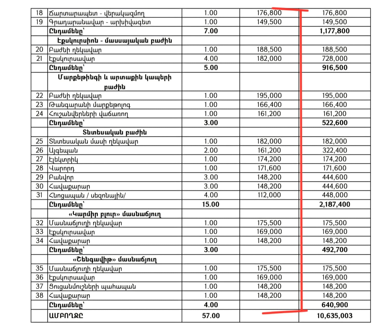 Այստեղ անզեն աչքով երևում է, որ 57 հոգուց առաջին 3֊ի մոտ է համեմատաբար բարձր աշխատավարձ, իսկ «դժբախտ» մարքեթոլոգի, բանվորի, էքսկուրսավարի կամ հավաքարարի աշխատավարձերը միջինը 140֊190 հազարի սահմաններում են՝ նախարարներից մոտ 20 անգամ կամ 2 հազար տոկոսով պակաս։