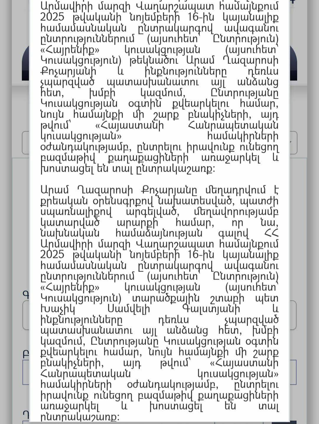Երեկ տեղի է ունեցել «Ուժեղ Հայաստան» կուսակցության համագումարը, որտեղ հաստատվել են ընտրական ցուցակի առաջին 36 թեկնածուների անունները։ Ուշագրավ է, որ այդ անունների մեջ չկան վերոնշյալ կուսակցությունների անդամների անունները: