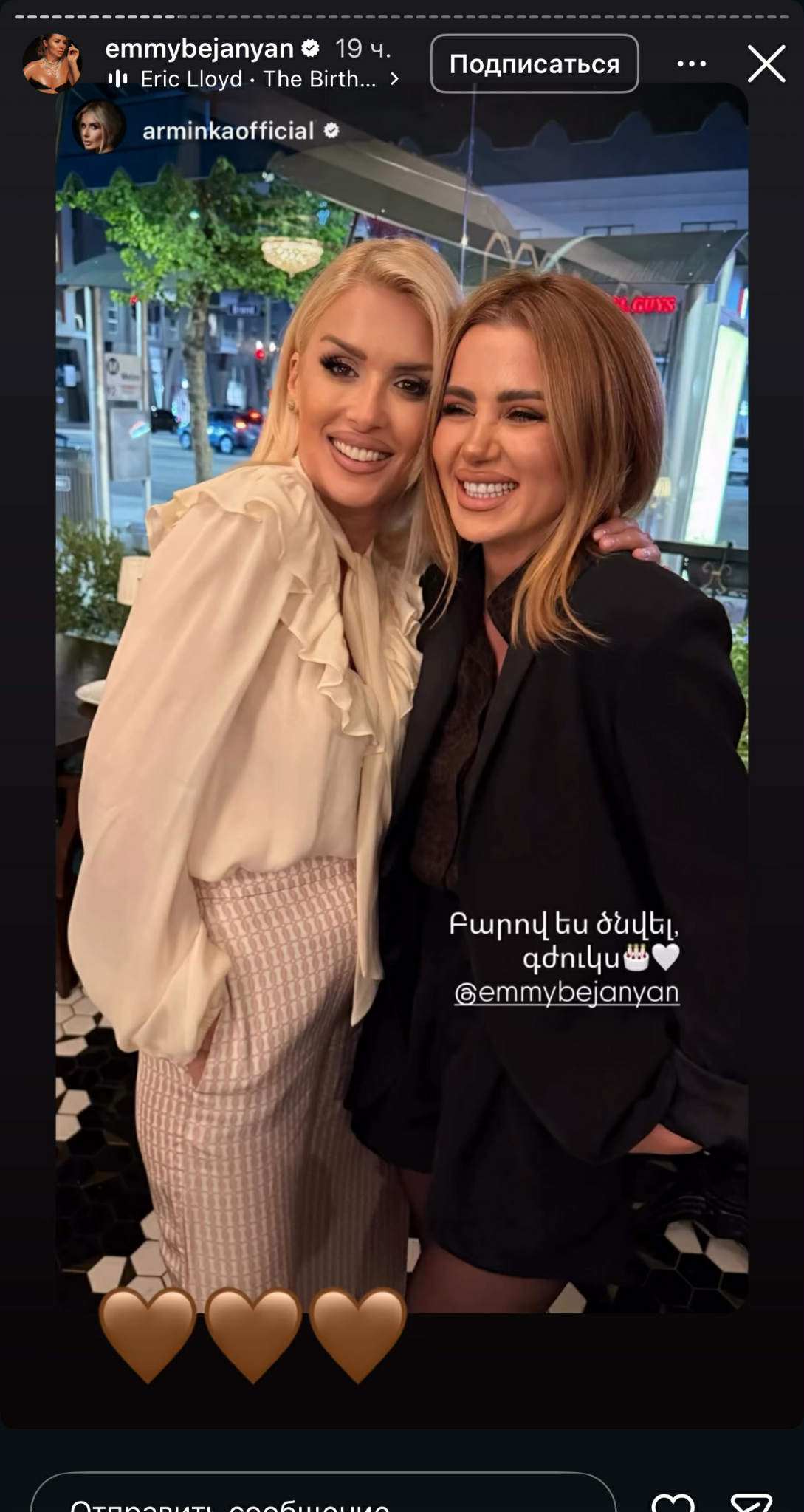 Երգչուհու ծննդյան օրվա առթիվ հուզիչ գրառումներ են կատարել մի շարք հայտնիներ. Արմինկան կիսվել է գեղեցիկ լուսանկարով՝ մակագրելով. «Բարով ես ծնվել, գժուկս»։