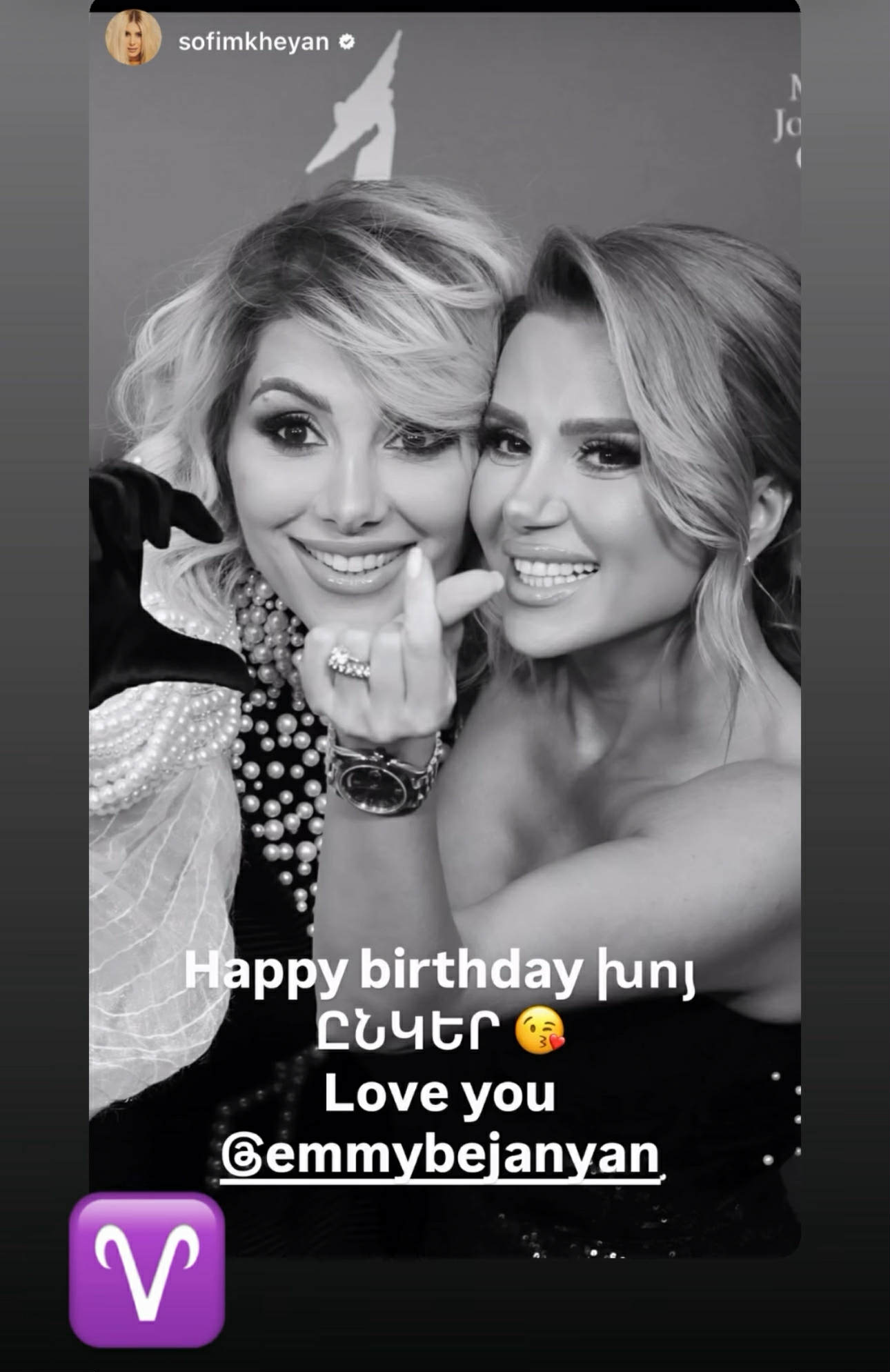 Սոֆի Մխեյանը հրապարակել է ջերմ սև-սպիտակ լուսանկար՝ Էմմիին անվանելով «խոյ ընկեր» (ակնարկելով նրա կենդանակերպի նշանը) և խոստովանելով իր սերը։